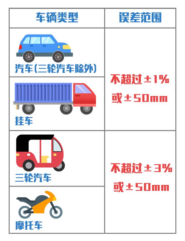 注冊(cè)登記安全檢驗(yàn)時(shí),機(jī)動(dòng)車外廓尺寸實(shí)測(cè)值不應(yīng)超出GB7258、GB1589規(guī)定的限值,且與機(jī)動(dòng)車產(chǎn)品公告,機(jī)動(dòng)車出廠合格證記載的數(shù)值相比,誤差應(yīng)滿足: